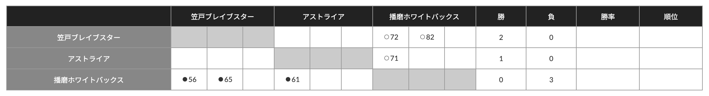 播磨ホワイトバックス | 18 | 12 | 17 | 14 | 61 |
