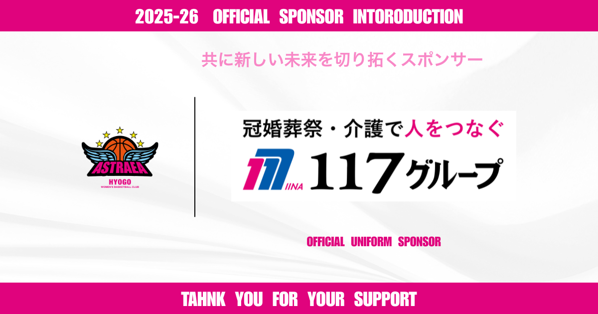 アストライアは、117グループ(兵庫県姫路市、代表:山下裕史)と、2025-26シーズンオフィシャルユニフォームスポンサー契約を更新いたしましたのでお知らせいたします。掲出場所は淡色ユニフォームシャツの背面番号下です。